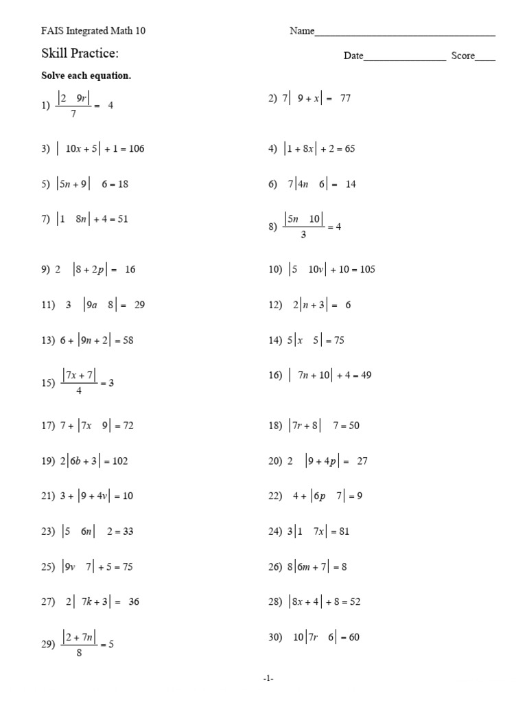 Solving Absolute Value Equations Worksheet 1 4 Skills Practice solving